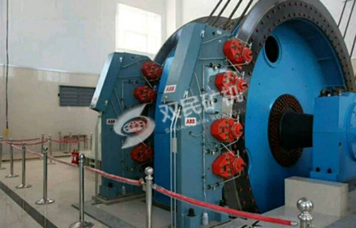 JKMD型多繩摩擦式提升機(jī)采用低速電動(dòng)機(jī)時(shí)可不用減速器,電動(dòng)機(jī)直接與卷筒主軸相連,或?qū)㈦妱?dòng)機(jī)轉(zhuǎn)子裝在卷筒主軸的末端。傳動(dòng)功率大時(shí),可采用2臺(tái)或4臺(tái)電動(dòng)機(jī)同時(shí)驅(qū)動(dòng)。一臺(tái)提升機(jī)的總功率已達(dá)到11600千瓦。制動(dòng)系統(tǒng)是保證提升機(jī)安全運(yùn)行的重要裝置。遇緊急情況時(shí),制動(dòng)系統(tǒng)應(yīng)通過(guò)可調(diào)節(jié)制動(dòng)力矩的液壓系統(tǒng)產(chǎn)生兩級(jí)安全制動(dòng),以保證提升機(jī)及時(shí)停車(chē)又不生產(chǎn)制動(dòng)過(guò)猛現(xiàn)象。交流電動(dòng)機(jī)驅(qū)動(dòng)的提升機(jī)。其制動(dòng)系統(tǒng)還要具有靈敏的制動(dòng)力矩可能性能,以準(zhǔn)確控制提升機(jī)在臨近通車(chē)點(diǎn)時(shí)的運(yùn)行速度。